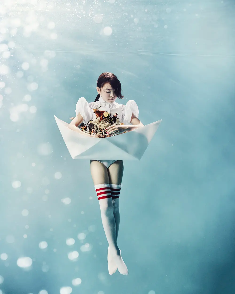 Dans cette photographie underwater réinventant l'Arche de Noé, une jeune fille guide un frêle esquif en papier parmi les courants. Elle porte en elle le devenir du monde, protégeant chaque espèce comme une promesse de vie sous la surface. Cette œuvre d'art subaquatique interroge notre avenir : la jeunesse n'est-elle pas l'ultime refuge et l'unique espoir de demain ?